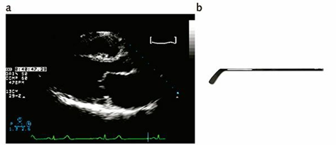 Figura 1 – Janela paraesternal eixo longo ilustrando a cúspide anterior mitral (a) em aspecto de bastão de hóquei (b).