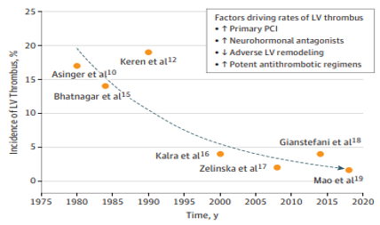- McCarthy CP, Murphy S, Venkateswaran RV, et al. Left ventricular thrombus after acute myocardial infarction. JAMA Cardiol. 2018.