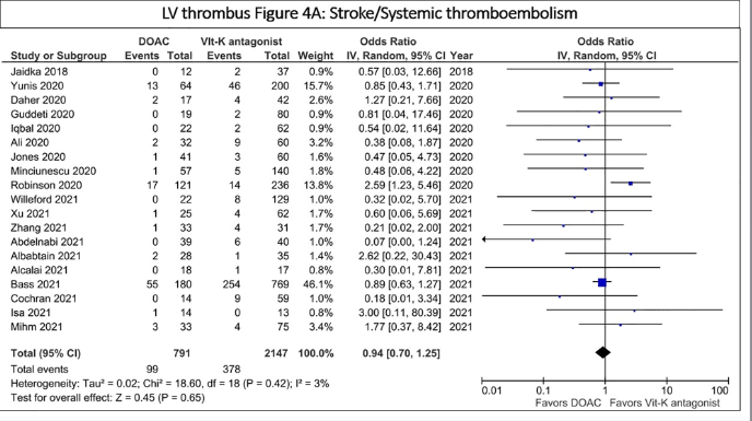 Figura 3: Meta-análise comparando DOAC vs varfarina em contexto de trombo em VE.