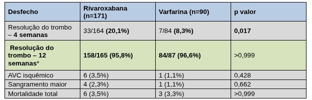 O estudo RIVAWAR avaliou a eficácia e segurança da rivaroxabana em comparação à varfarina no tratamento do trombo em ventrículo esquerdo após infarto do miocárdio. Trata-se de um ensaio clínico randomizado, aberto, de não inferioridade, que incluiu 261 pacientes com trombo ventricular esquerdo confirmado, sendo 171 tratados com rivaroxabana e 90 com varfarina. No desfecho precoce em 4 semanas, a taxa de resolução do trombo foi numericamente maior no grupo rivaroxabana, sugerindo resolução mais precoce do trombo quando comparada à varfarina. Já no desfecho primário em 12 semanas, que avaliou a resolução do trombo ventricular esquerdo, os resultados foram semelhantes entre rivaroxabana e varfarina, confirmando a não inferioridade da rivaroxabana nesse contexto.